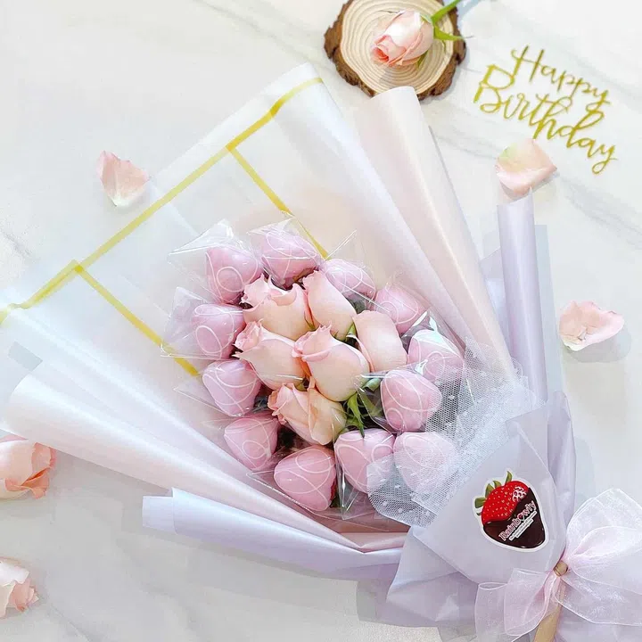 You can get the Pinky Wish Chocoberry Flower Bouquet ($129) from Rainbowly which features their signature chocolate-coated strawberries that are arranged together with three stems of roses, or you can even add more.