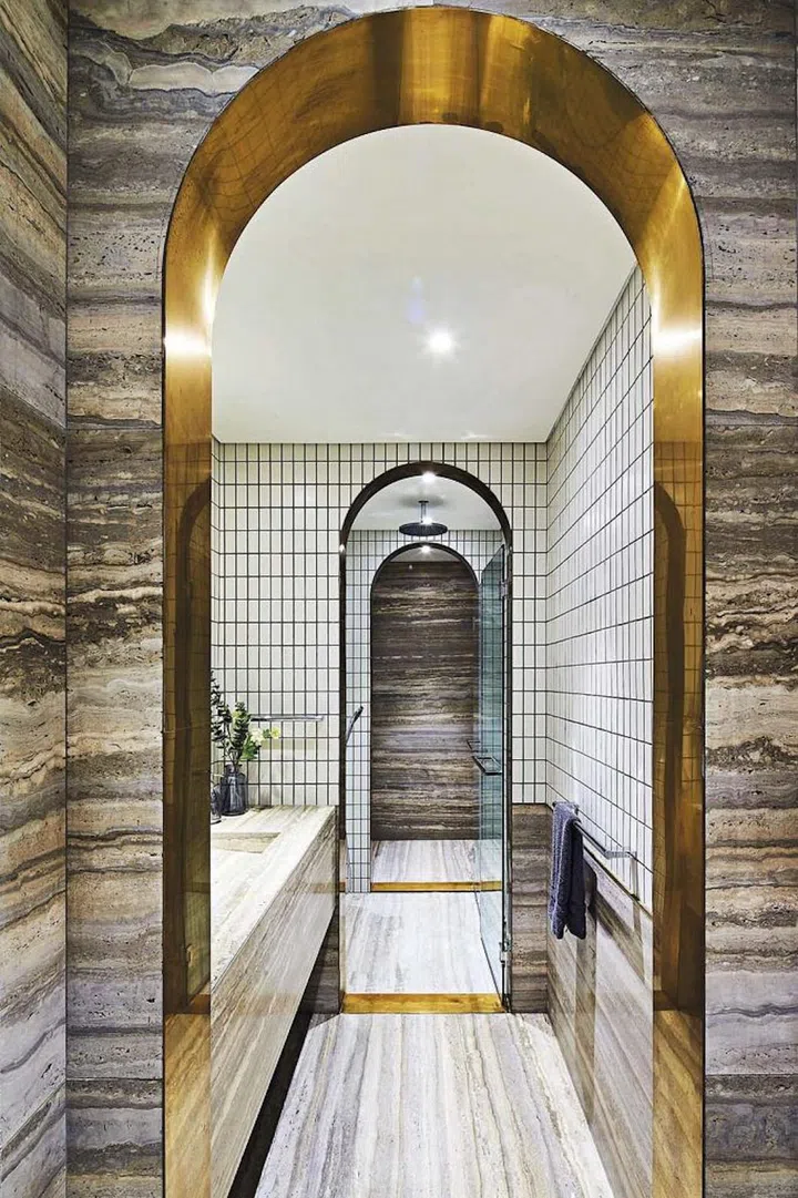 An arched entryway makes for a special first impression. You can create an arched doorway in any walls you like, as long as it doesn’t interfere with the structure of the building – consult your designers and or contractors! This gilded archway in the bathroom by Super Assembly and Formwerkz Architects is a daring example.