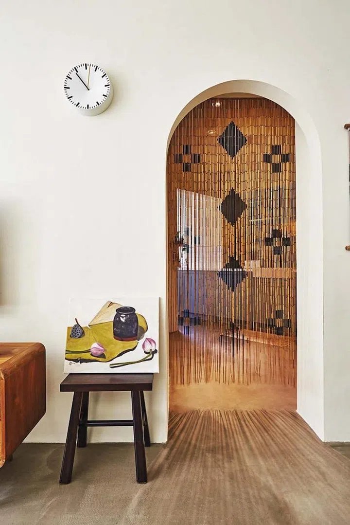 An arch is an eye-catching architectural element that not only adds a curve that softens the overall feel of the space but also frames your interior beautifully, creating Insta-worthy vignettes within your home. Highlight the archway with contrasting finishes or beaded curtains for a retro vibe, like this home by Monocot Studio.