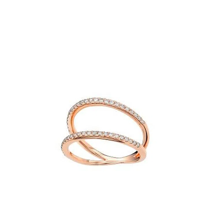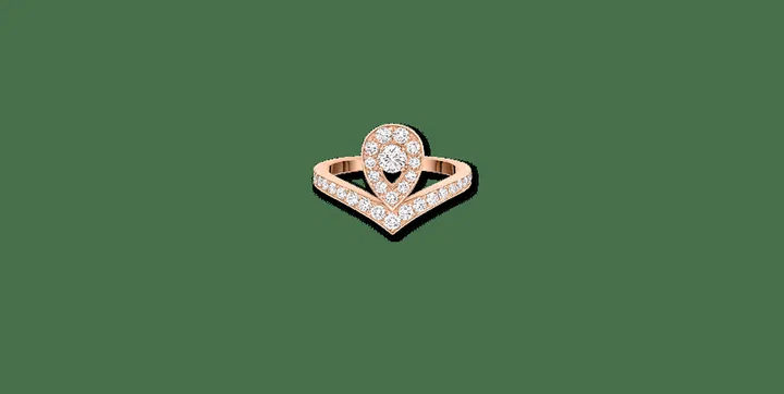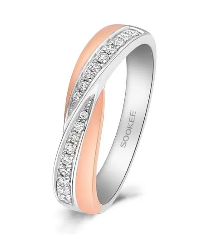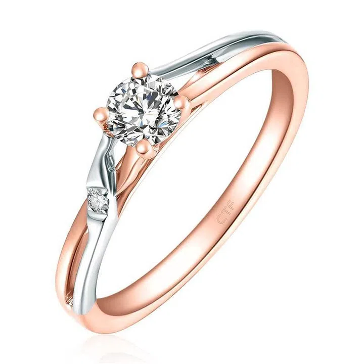 If you've got a modern or architectural aesthetic, you'll love this geometric rose and white gold ring from Hong Kong jeweller Chow Tai Fook. The band comes with one smaller diamond on top, and two small diamonds at the side.