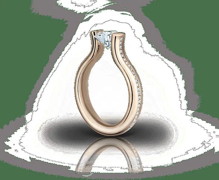 If you love looking at how your diamond looks in the light, consider a tension ring like this, which lets your gem sparkle brilliantly at all angles. We also like how this ring, which is traced with a line of diamonds on the outside, exudes a vintage vibe thanks to its rosewood gold material.