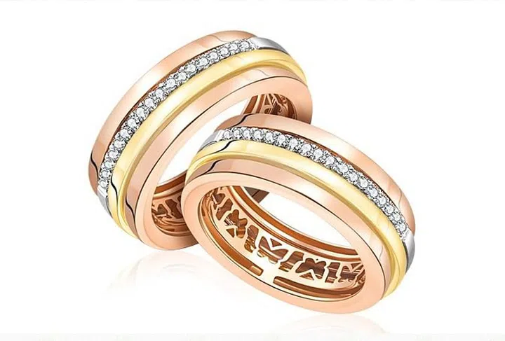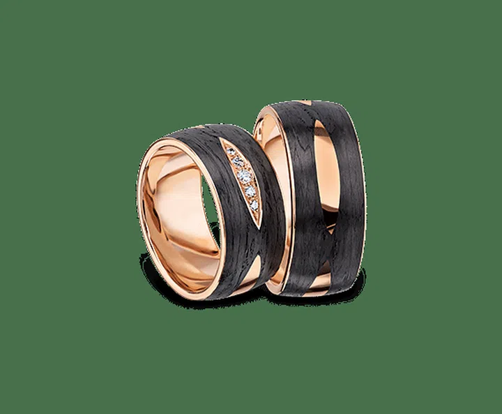 Prefer something more masculine? This pair of rose gold and black carbon bands are perfect for you and your husband.