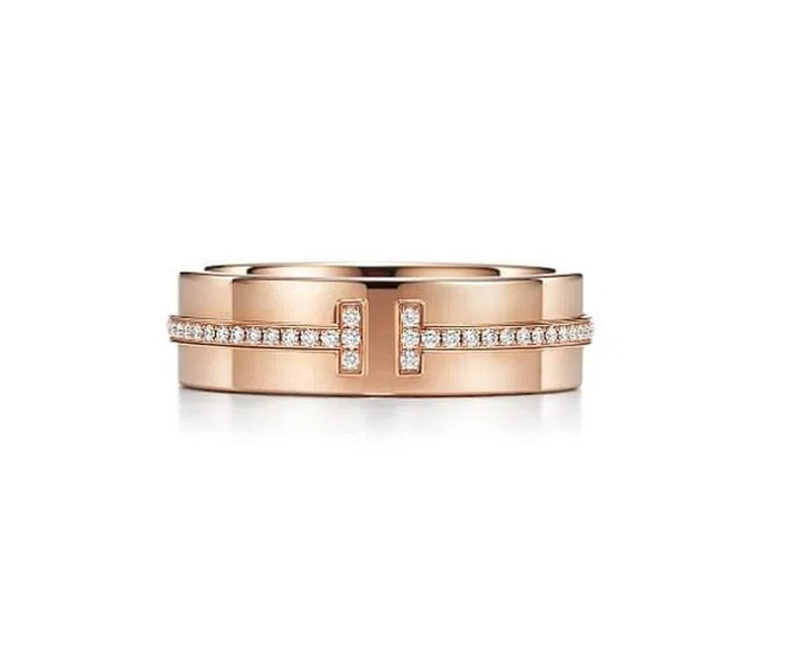 The unisex design, which features a dynamic interpretation of the famous T designs, and comes in wide bands of 18K yellow, white or rose gold, or sterling silver, and with or without diamonds, makes perfect matching wedding bands.
