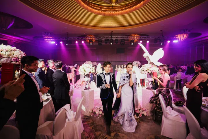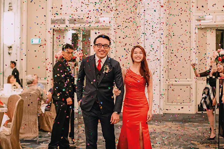 If you’ve got the budget, ask your planner or coordinator if you can arrange for a built-in entrance (such as coming up through the floor in the middle), or appear from the stage instead of the ballroom doors - like how Actress Cheryl Wee and her husband Roy Fong performed a sweet couple duet for their second walk-in.