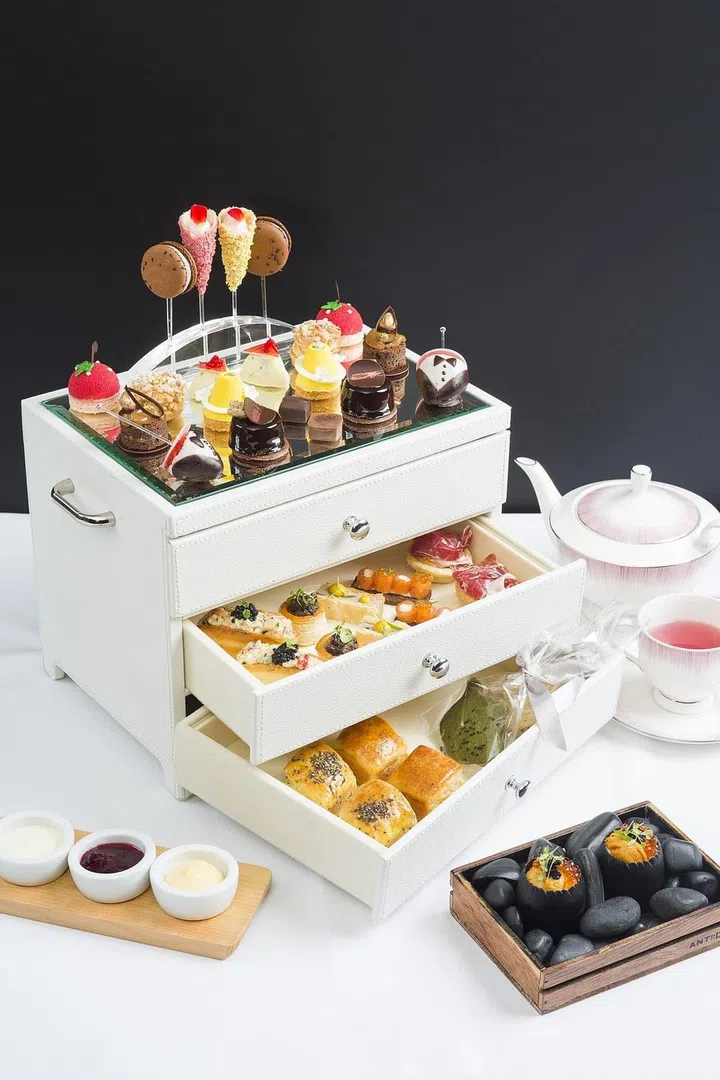 This cosy spot adjoining Anti:dote’s main bar is where you and your girlfriends can sip afternoon tea and marvel at the exquisite white leather-clad jewellery drawer-chest filled with elegant sweet and savoury bites.