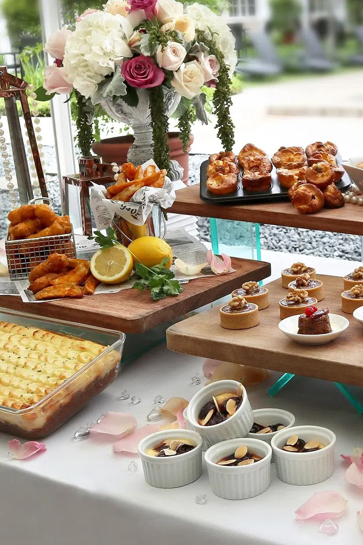 Hearty hot items include braised pork with stout in hot pot served with homemade brioche; Toad in the Hole (a classic sausage bake); fish and chips with malt vinegar; cottage pie; as well as mini corned beef and leek quiche. There’s even a live carving station featuring baked salmon florentine puff served with wild rice and horseradish cream.