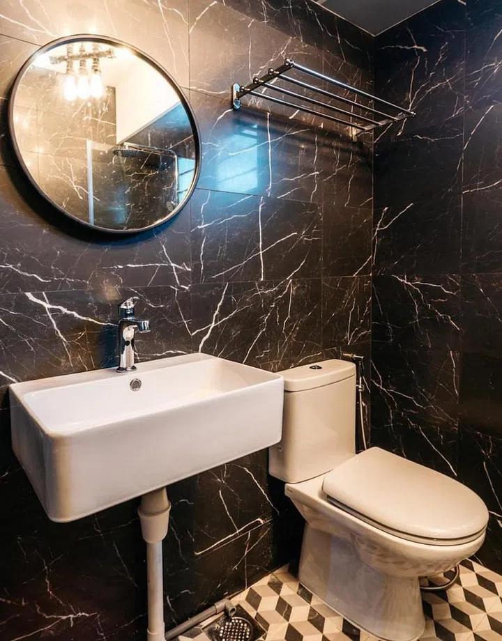 Bring about a sense of sophistication by cladding your bathroom’s floors and walls with white marble that has grey veins.