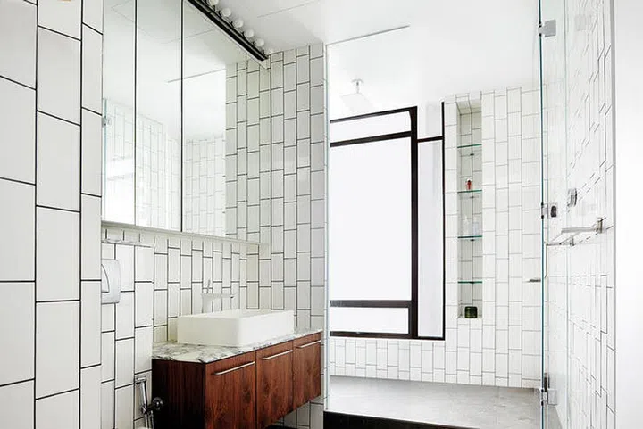 Can’t get enough of the subway tiles trend? Try something slightly different by laying them vertically. The linear patterns created by the black grouting also inject a bit of fun into the white walls.