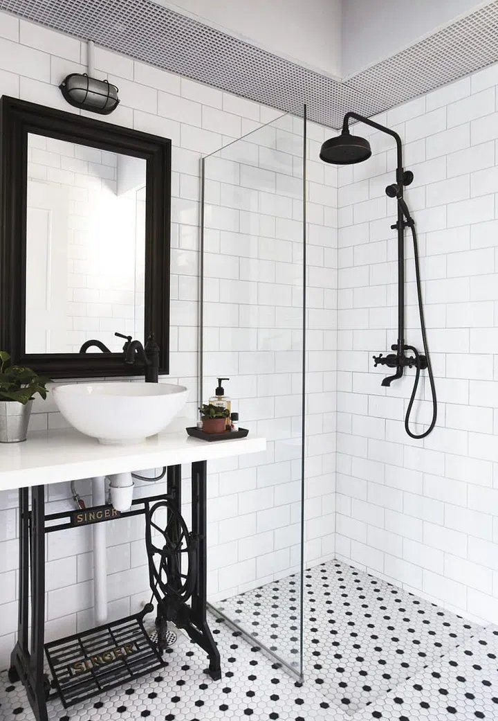 The legs of a Singer sewing machine support the vanity and sink in this black-and-white bathroom.