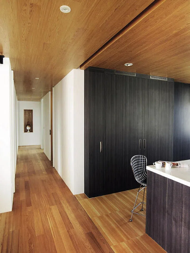 A strong design language can be reiterated with just the choice of materials. Here, the architectural skeleton of the home becomes the focal point with timber flooring and a matching wood-look wallpaper for the ceiling.