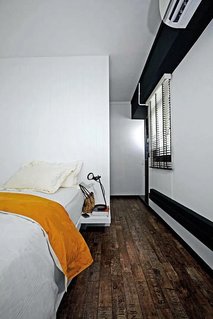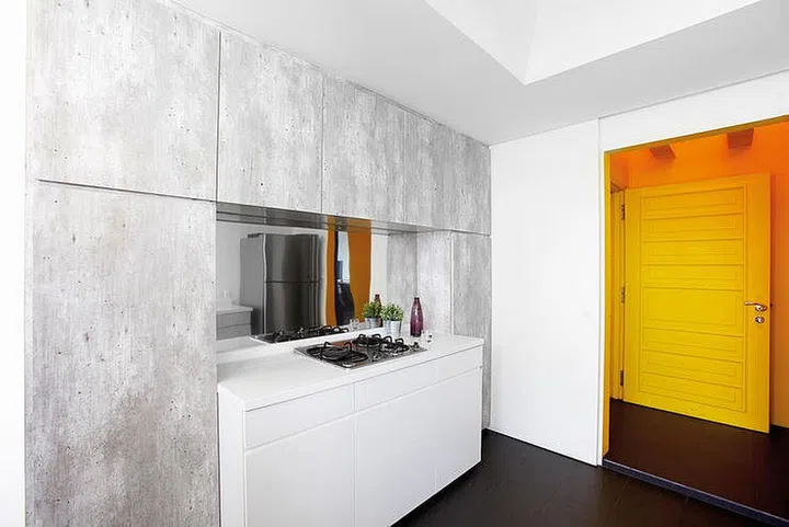 Clutter has been effectively removed from this minimal HDB apartment thanks to an anchoring “box” that conceals shelves, wardrobes, and even a washroom. Discover more ways to conceal eyesores in your home here!