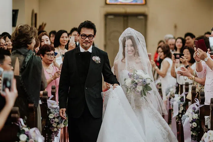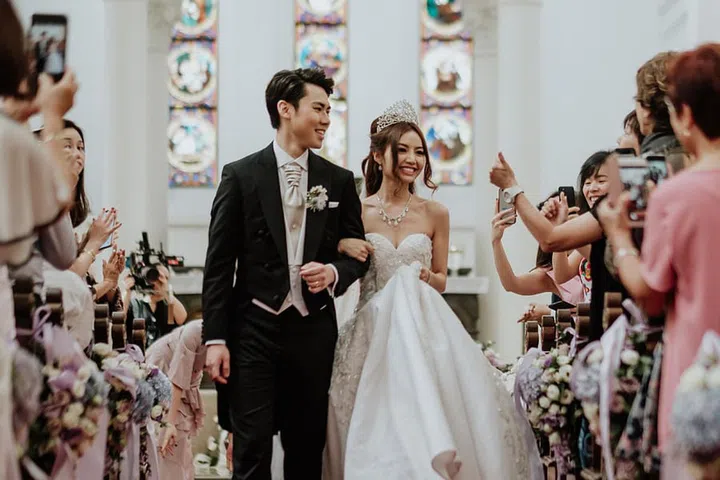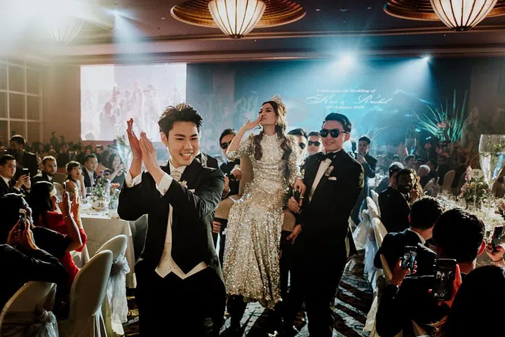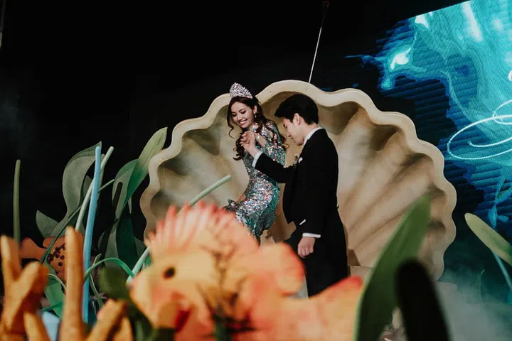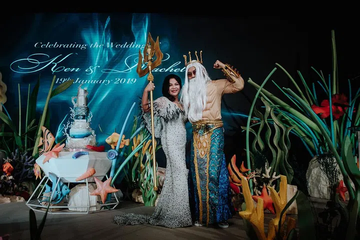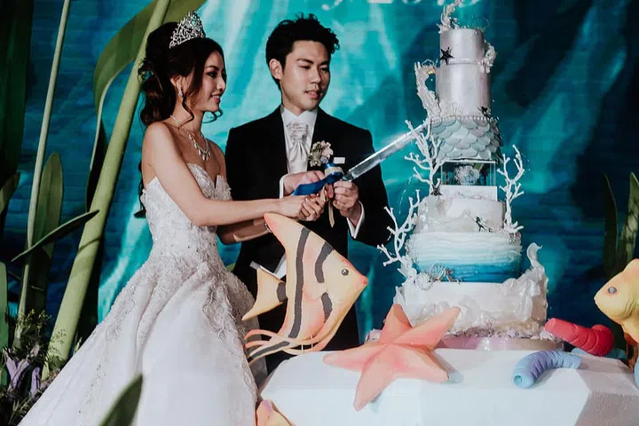 Rachel Wee and Ken Chen treated their guests to an unforgettable underwater-themed wedding banquet at The Ritz-Carlton, Millenia Singapore that saw plenty of shimmery sea-inspired details and the bride making an entrance in a life-sized clam.