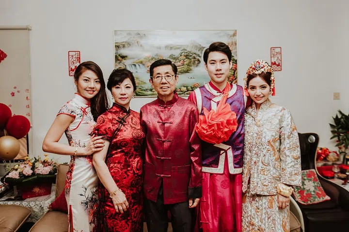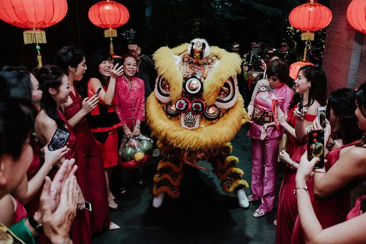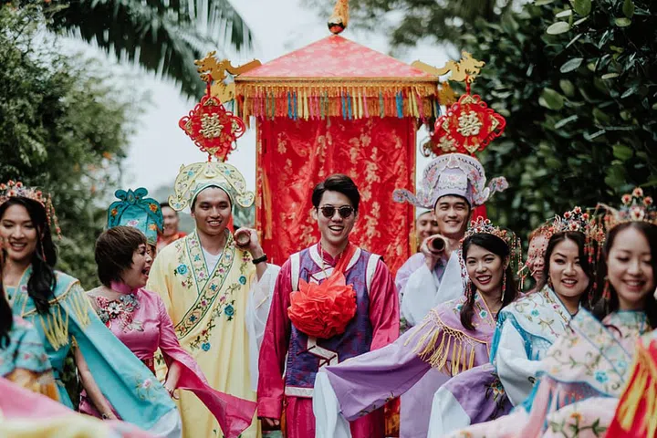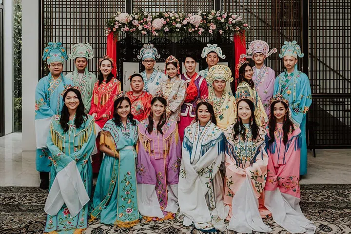 We celebrated with three events over two days: the tea ceremony and lunch on the first day, and the church mass and dinner the next day. We wanted the tea ceremony to be traditional and fun, so we entered my family home in a bridal sedan and our entourage wore Tang dynasty costumes.