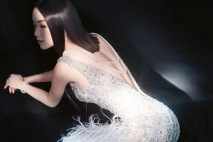 There's something utterly sensual about lustrous pearls laying languidly across an open back. Paired with this fully-embellished, plumed gown, the mood is decidedly alluring with a touch of Gatsby glamour.