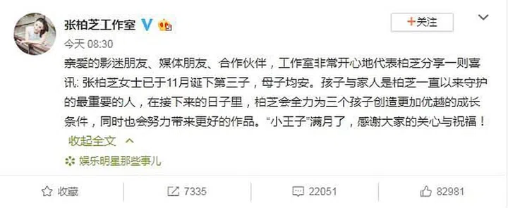 In a Weibo message addressed to fans and the media on Monday morning (Dec 17), her management company shared that Cheung had given birth to a baby boy in November and has just celebrated his full month.