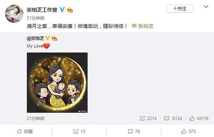 The 38-year-old beauty also posted a photo her Weibo account several hours later, which showed a caricature of herself carrying a baby, while being surrounded by two other boys. She captioned the image, "My Love".