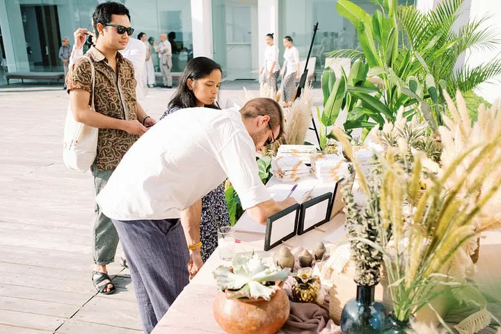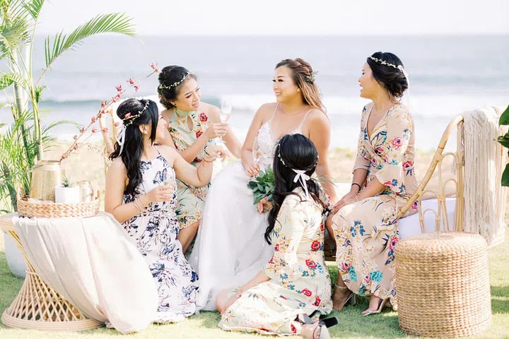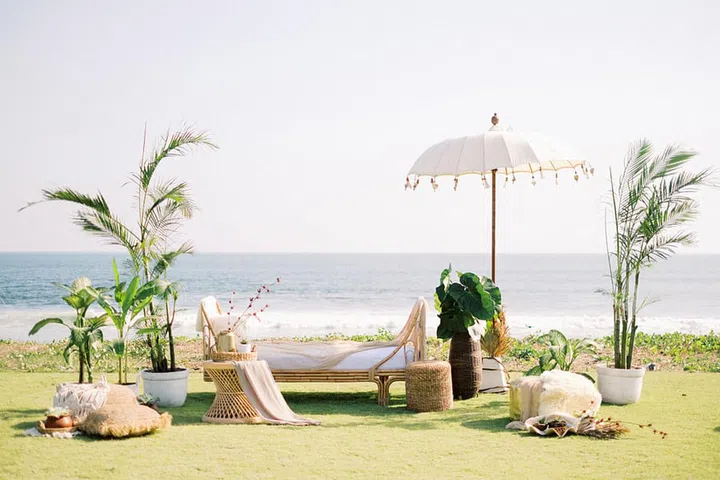 This couple went flower-free for their boho beach picnic-themed wedding in Bali