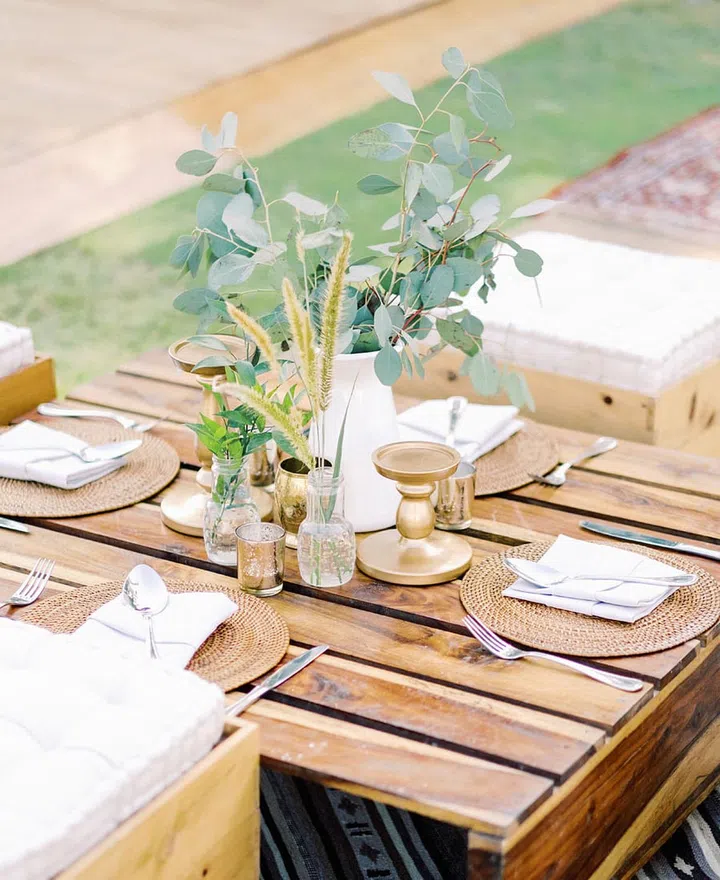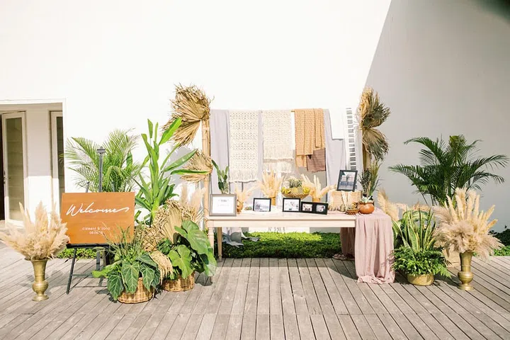Pampas grass and dried palm leaves were used throughout the decor and settings.