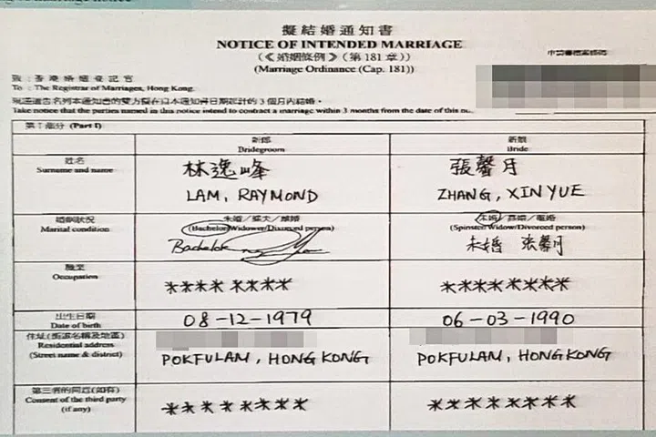 The official filing, which was submitted to Hong Kong’s Registrar of Marriages office on September 26 bore the names "Lam, Raymond" and "Zhang, Xin Yue", and matched their dates of birth.