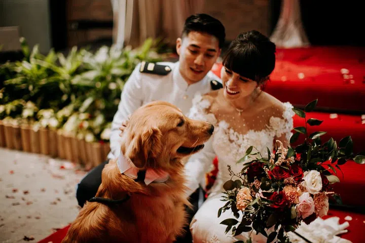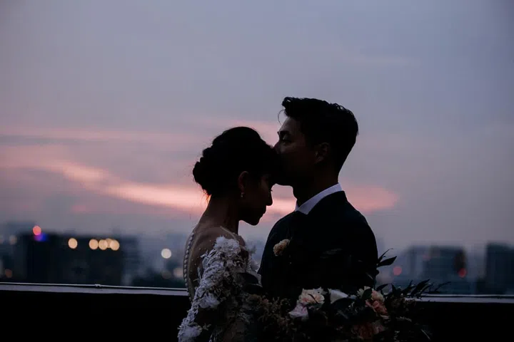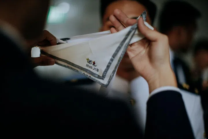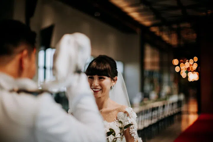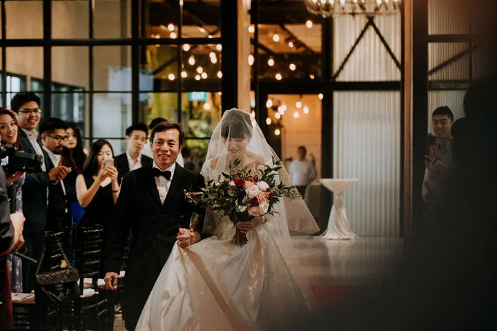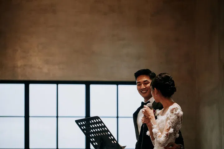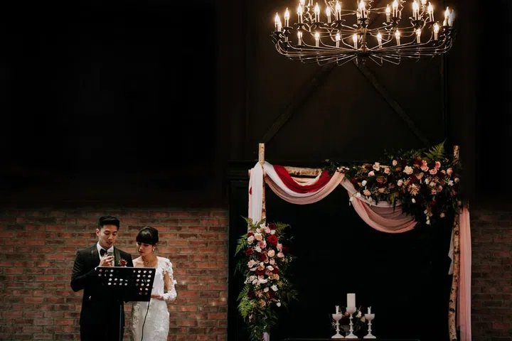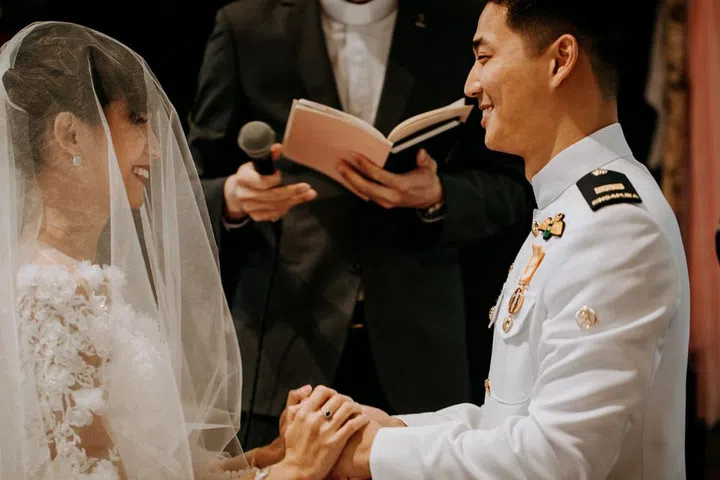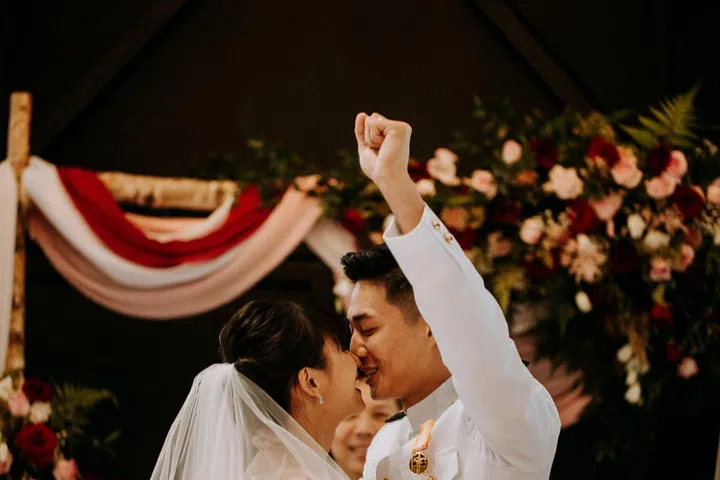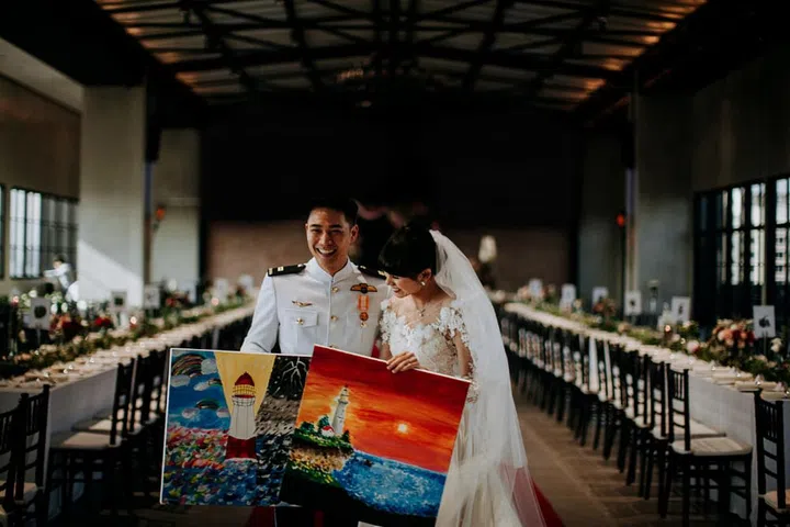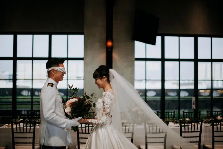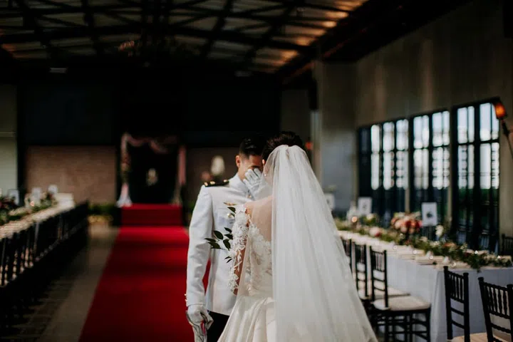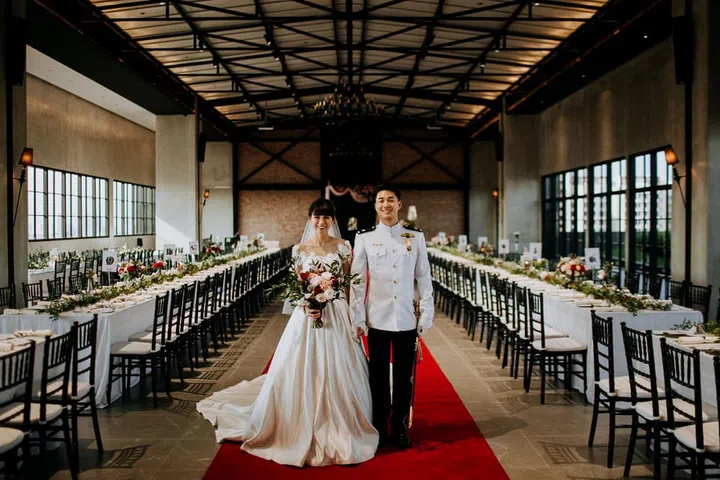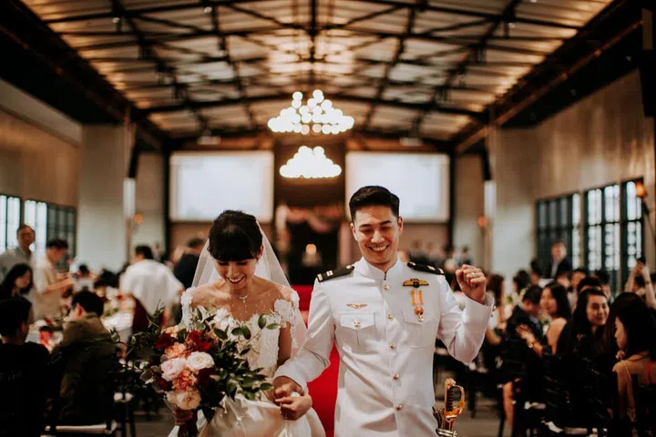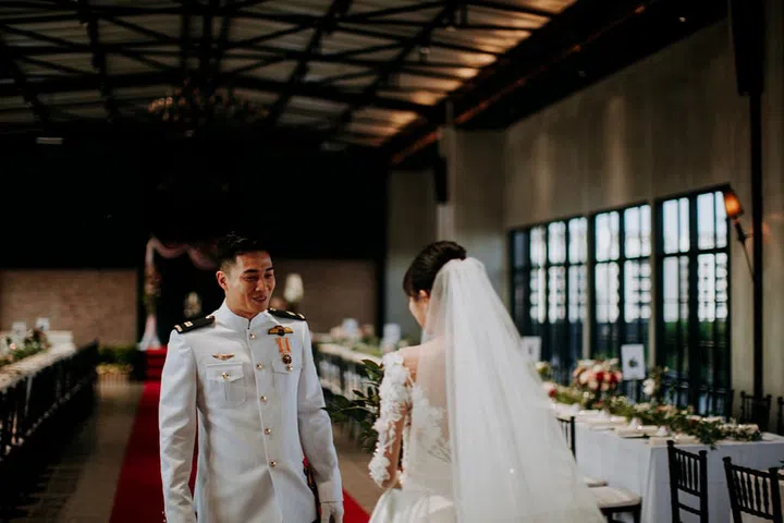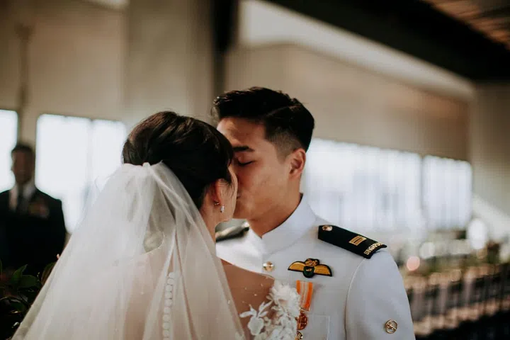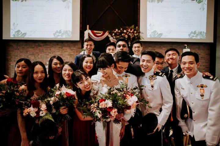 Lenice Tan, florist and owner of Skinny Blooms, and Elisha Lin, a Republic of Singapore Air Force (RSAF) officer, both 26, tied the knot in an elegantly appointed celebration under the high ceiling of The Ahava.
