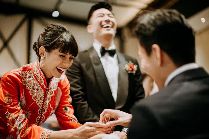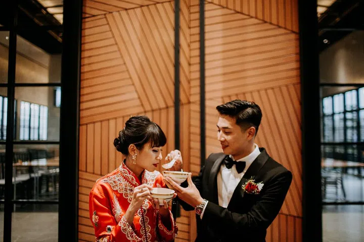 Eating glutinous rice balls is a traditional Chinese wedding custom that symbolises happiness for the newlyweds.