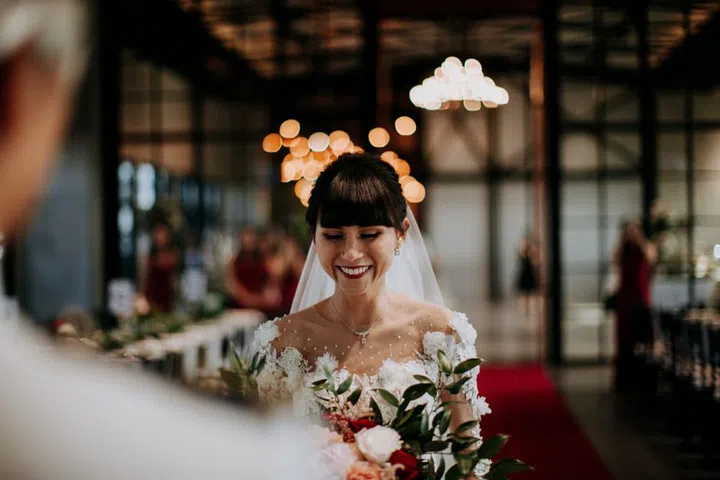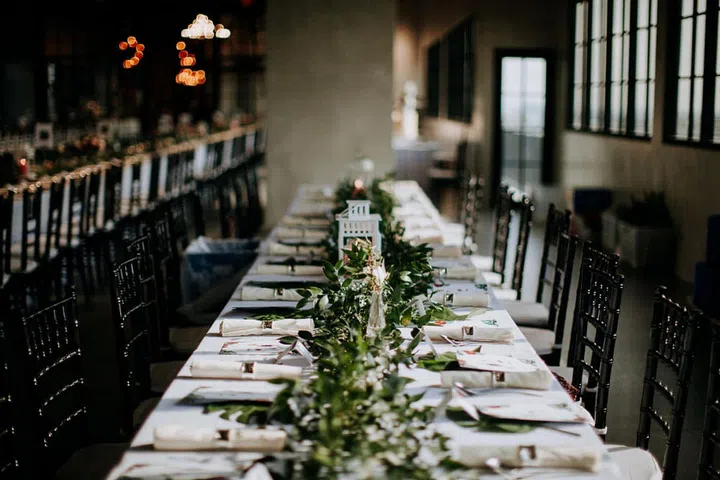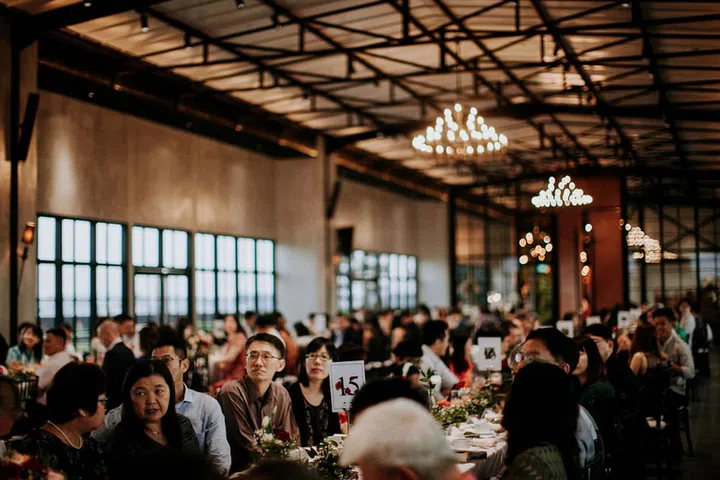 We kept our table arrangements minimal and Westernised in style, with long tables in two long rows alongside the aisle. These complemented the industrial facade of the venue.
