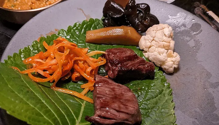 There are also plates filled with red leaf lettuce from South Korea and shiso leaves. The meat-driven meal doesn’t feel too heavy or overly greasy as these lettuce wraps are being wolfed down effortlessly. Our meat ‘wrapper’ of choice is the shiso leaves that impart a floral sweetness to the meat that is offset by the umami from the ssam jang dip.