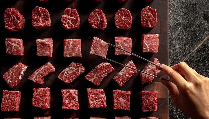 The marbling score of the meat progresses along the night. It starts off with the USDA Prime Filet Mignon and Australian Black Angus Skirt Steak and ends off on a high with the Miyazaki A5 Wagyu Ribeye.