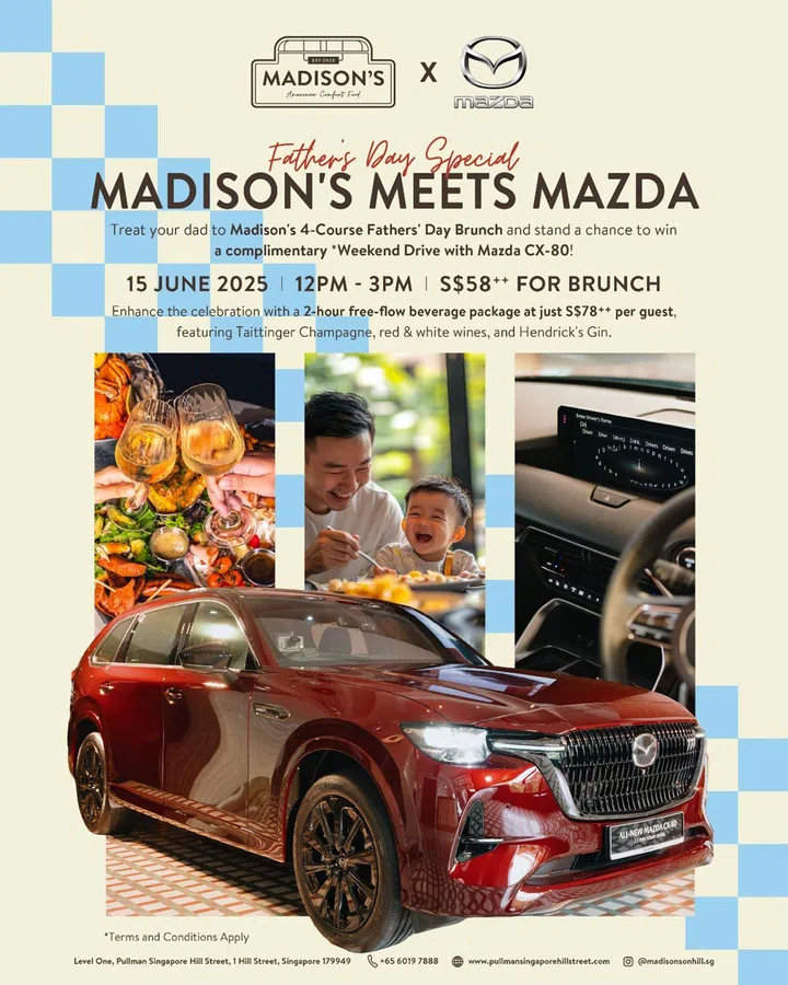 - Dads dining at Madison’s on June 15 can scan the QR code displayed on the A2 poster displayed beside the Mazda CX-80 to register for a test drive of the new Electrified Hybrid SUV at a Mazda showroom of their choice (Leng Kee or Ubi).