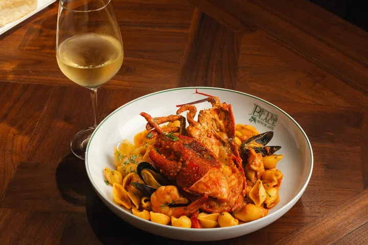 The tomato-based spaghetti conchiglie cioppino at Pete’s Place is worth the indulgence