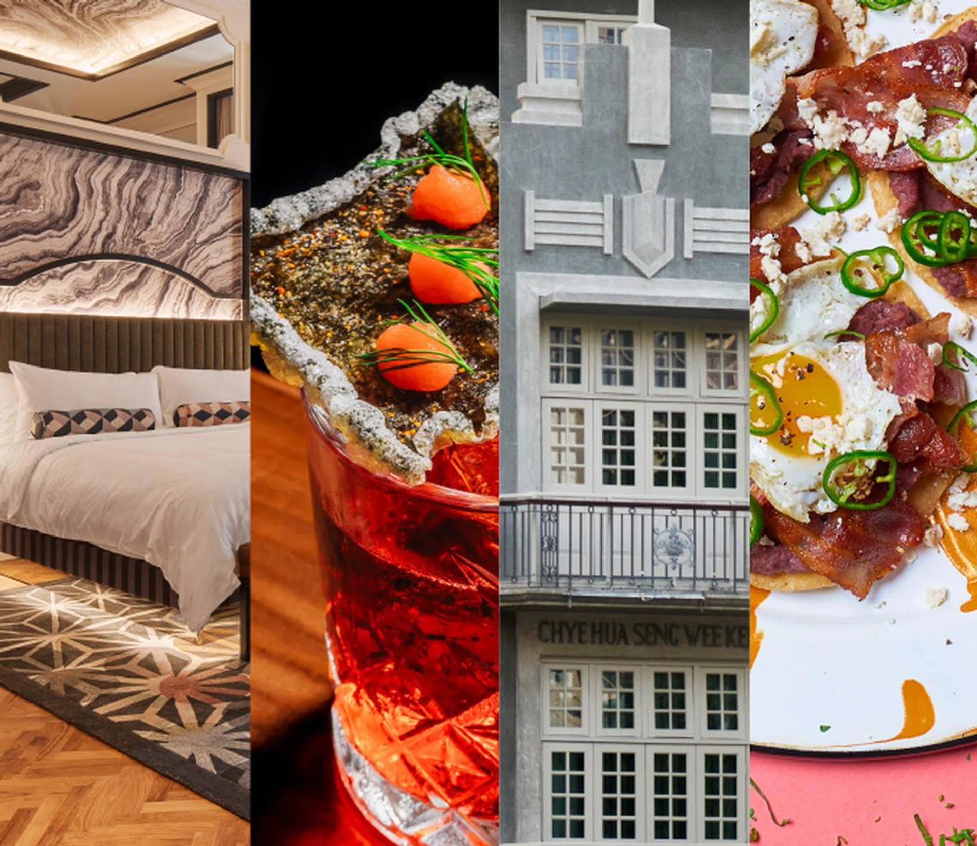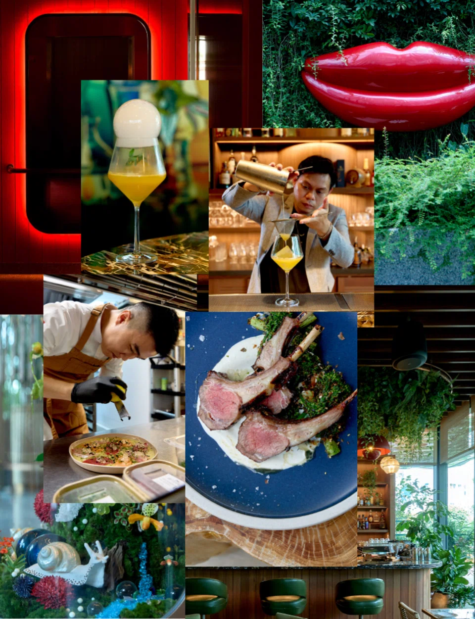 The Standard Singapore is one of the newest hotels to launch here. Clockwise from top left: The Standard’s Kaya Bar serves up inventive cocktails like the Hikari Spritz. San Trey, who heads Kaya Bar, is behind these creations. Lamb & Furikake from Kaya. Chef Nicholas Cheng experiments with fermentation techniques