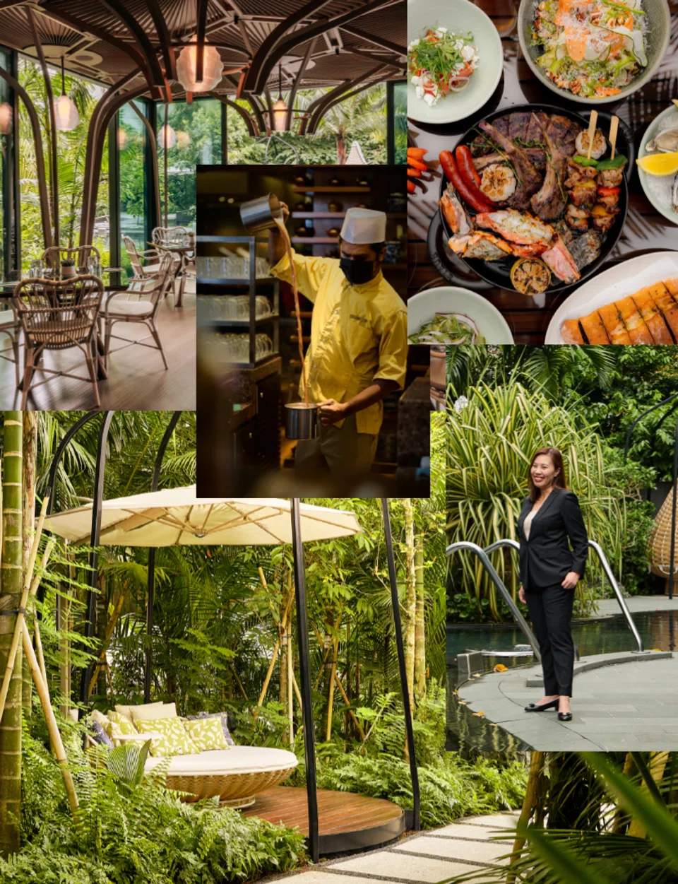 Grand Hyatt Singapore reopened its doors following an extensive makeover. Clockwise from centre: Halal buffet restaurant Straits Kitchen is known for its teh tarik. A barbecue platter feast at Oasis. Wendy Teo, director of sales and marketing, at the hotel’s refreshed rooftop jacuzzi and pool area