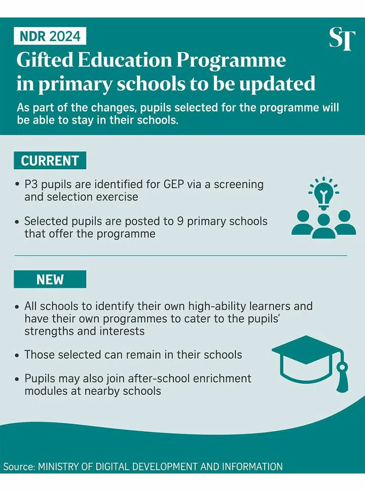 The shift, after 40 years of the GEP, is intended to signal the Government’s intent to take care of all students – not just early bloomers but also those who grow up in the heartland and attend neighbourhood schools, said PM Wong, who counted himself among this number.