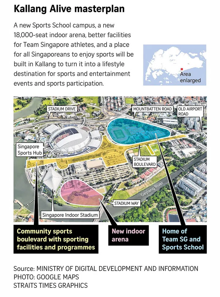 The national training centres for key sports will also be sited together there. The Sports School, which is located in Woodlands now, will move to the Kallang area so that student athletes can study and train with their seniors.