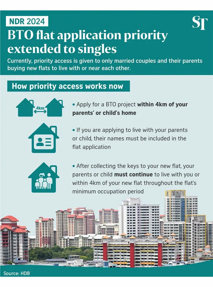 Singles applying for Build-To-Order (BTO) flats will get priority when buying a home near their parents from mid-2025. Currently, married children and their parents who are buying new flats to live with or near each other get priority access to BTO flats. This will soon be extended to all parents and their children – married or single.