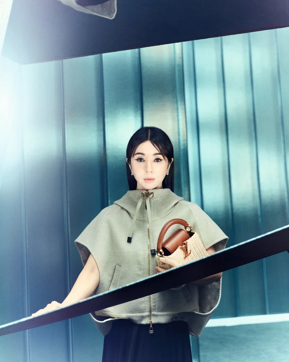 Double Face Open-Arm cashmere and wool jacket, and Capucines Mini rattan and cowhide leather handbag, Louis Vuitton