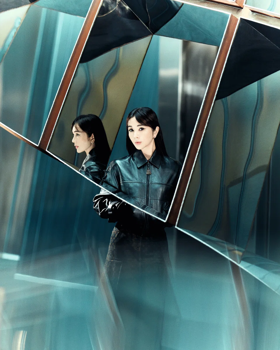 Zipped leather bomber jacket, and Le Damier de Louis Vuitton yellow gold double hoop earrings with diamonds (worn throughout), Louis Vuitton