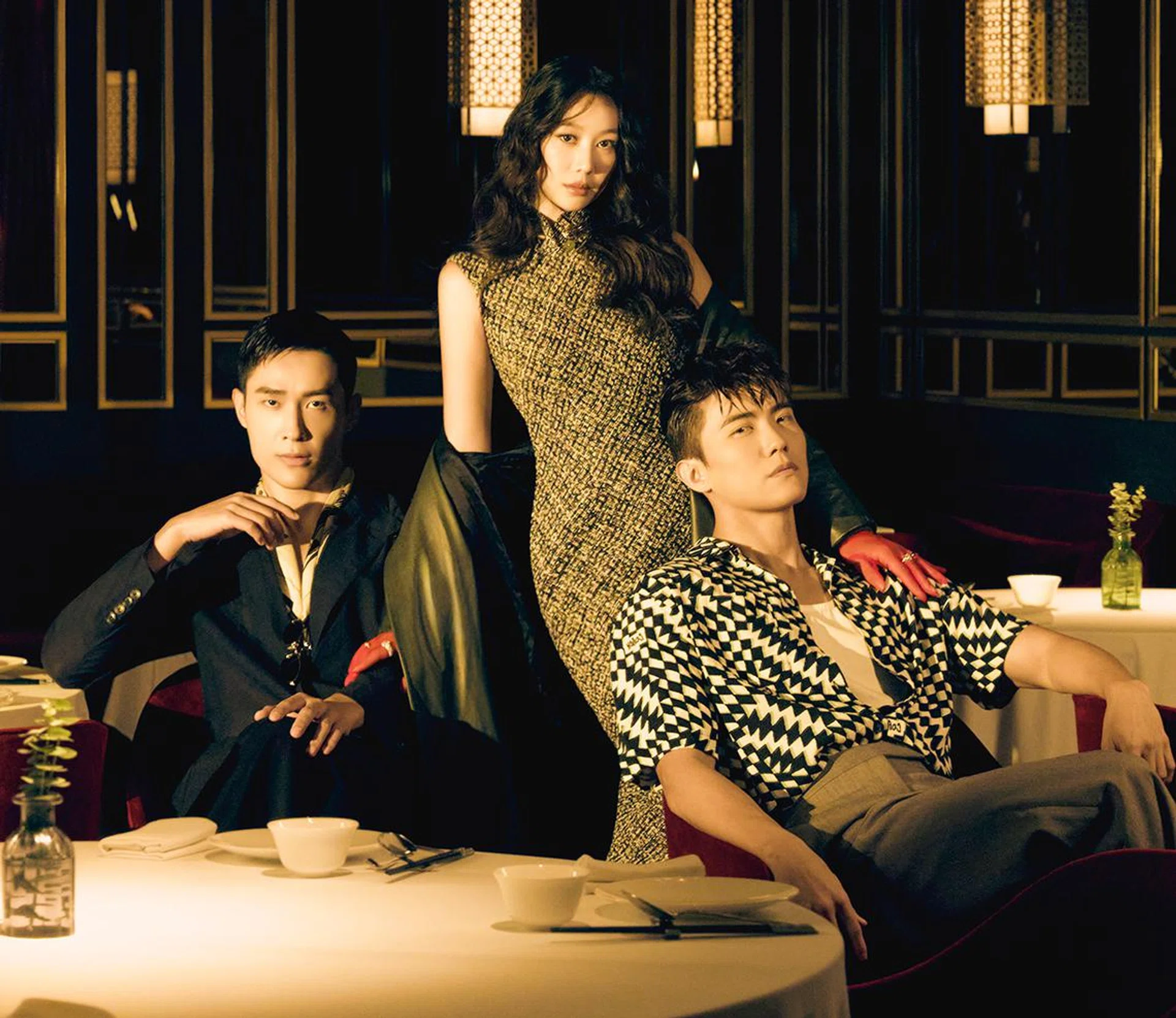 ON ZE TONG: Sleeveless vest and trousers, Dolce & Gabbana. B.zero1 Classic rose gold bracelet with pave diamonds, Bvlgari. ON TYLER: Shirt with zipper detail, Dolce & Gabbana. Linen trousers, Prada. B.zero1 Rock Chain white gold pendant necklace with pave diamonds, Bvlgari