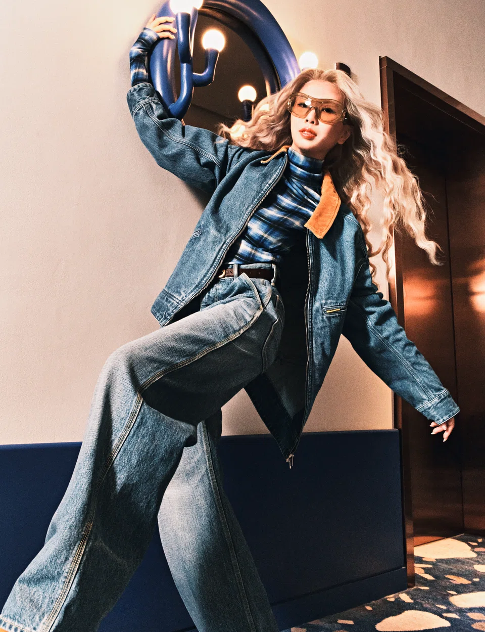 Oversized denim jacket and baggy jeans, Onitsuka Tiger. Checkered turtleneck top and fur skinny belt, Cos. Oversized tinted sunglasses, Burberry
