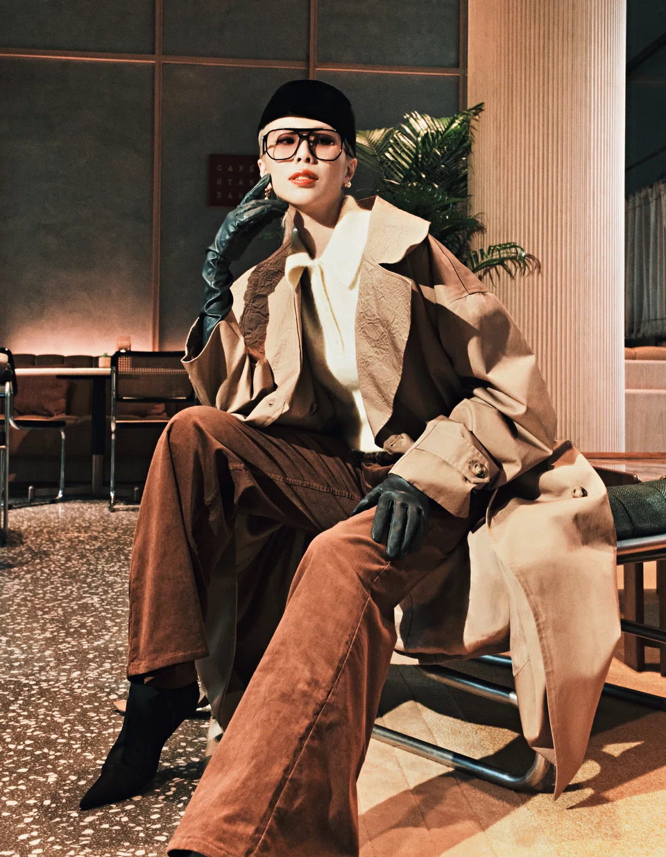 Cotton trench coat, Glenn Martens x H&M. Wool cropped blouse, and corduroy wide-legged trousers, & Other Stories. Mismatched drop earrings, knee-high sock boots, oversized sunglasses, and leather gloves, Cos. Pillbox hat, stylist’s own