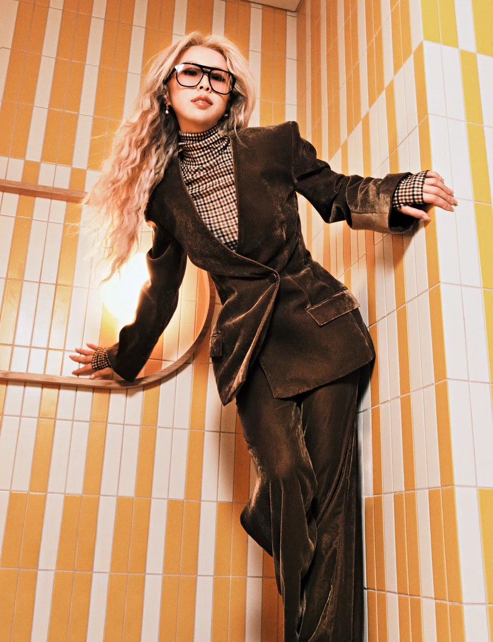 Velvet pantsuit, H&M. Checkered turtleneck top, oversized sunglasses and mismatched drop earrings, Cos