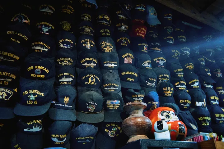 A display of navy caps hints at Johnny Two Thumbs’ roots as a tattoo parlour once popular with sailors from around the world