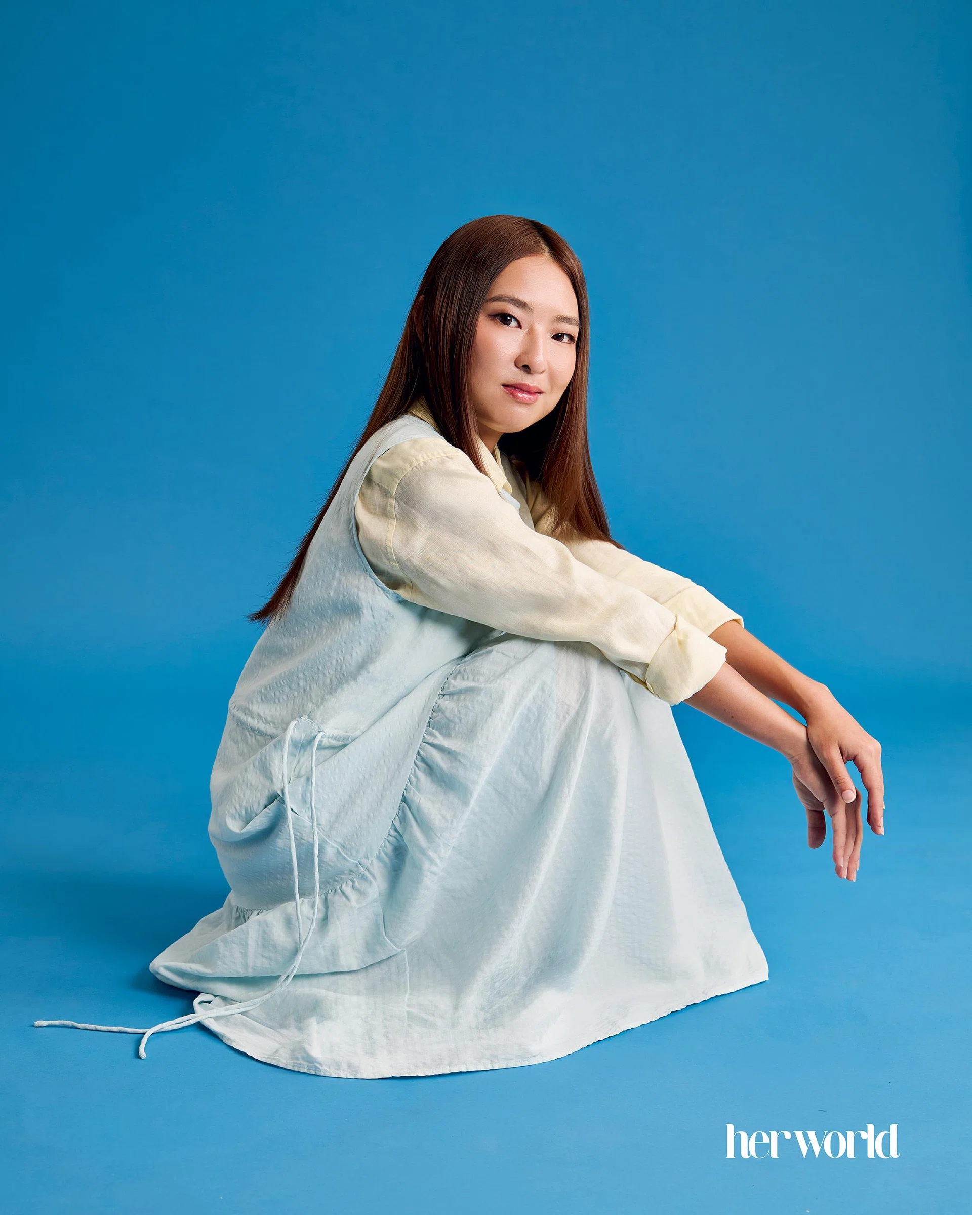Man Jing’s outfit: Premium Linen Long Sleeve Shirt, and Linen Blend Tiered Dress, Uniqlo