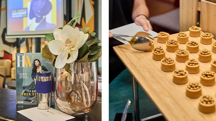 Left to right: Attendees were given a coffee tumbler to take home as well as a copy of the Her World March issue and three-day pass to the any of The Great Room spaces in Singapore; bite-sized delights from Luxe Catering kept guests well-fed