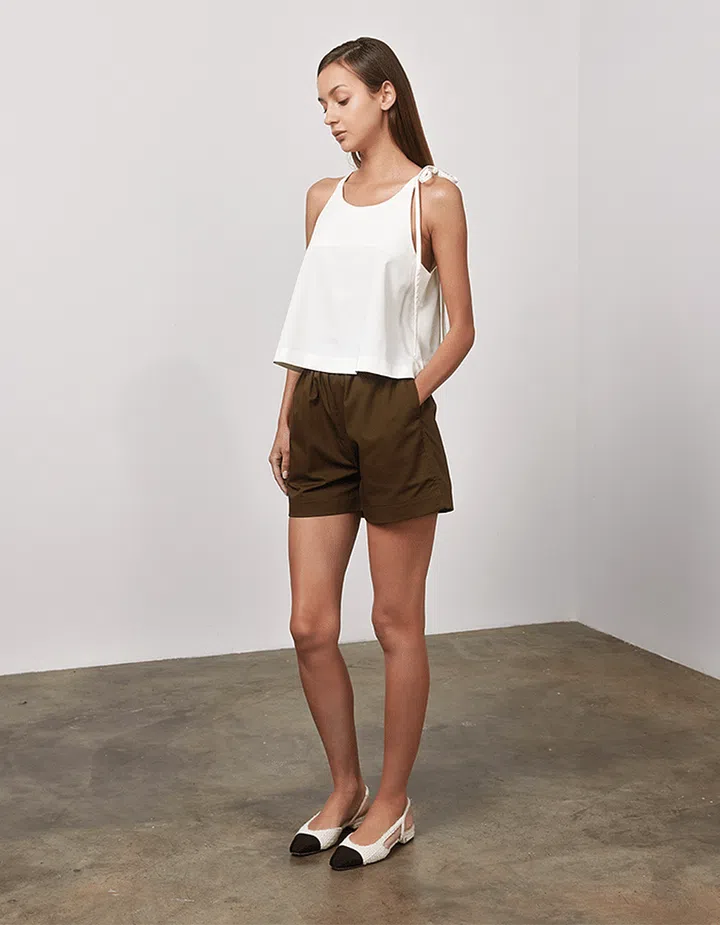 “Made from the studio’s favourite cotton fabric, this wardrobe essential is structured yet non-rigid. It features a self-tie ribbon on one side.”