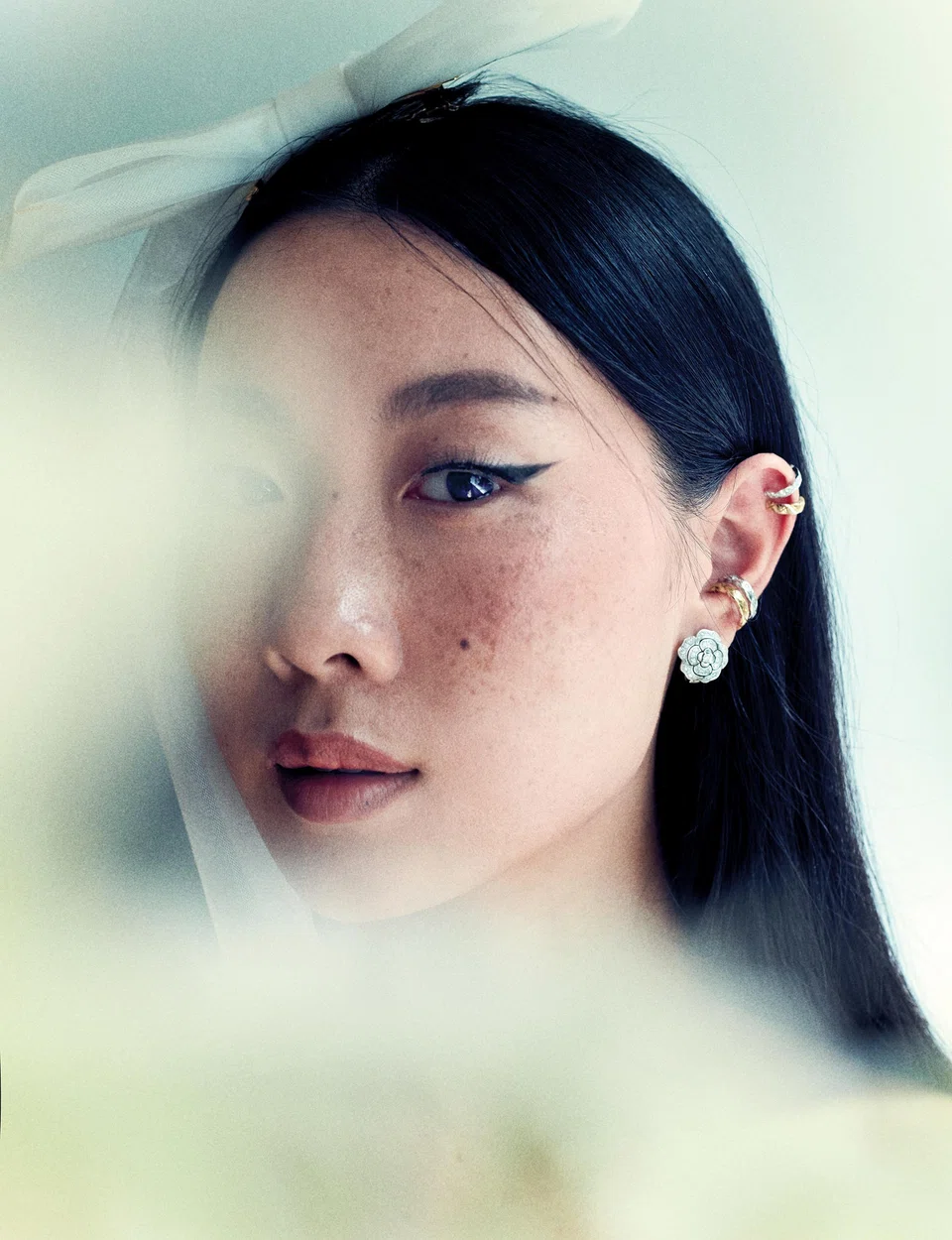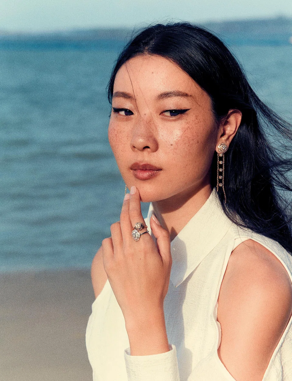 Bouton de Camelia 18K yellow gold supple transformable earrings with diamonds, Bouton de Camelia 18K white gold ring with diamonds, Extrait de Camelia 18K rose gold ring with diamond, and silk jacquard shirt with jewelled buttons, Chanel