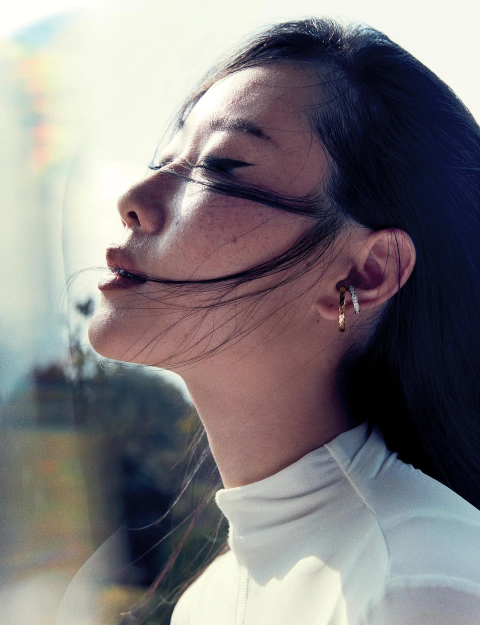 Coco Crush Hoops 18K yellow gold large earrings, Coco Crush 18K beige gold large ring, Coco Crush 18K beige gold small ring with diamonds, Coco Crush 18K white gold small ring with diamonds, Coco Crush 18K white gold small ring (stacked), and Coco Crush 18K beige gold mini ring with diamonds, Chanel. Sheer shawl, stylist’s own