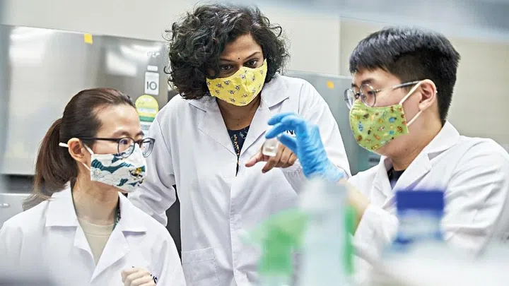 Prof Nalini with research assistants Tyrone Tan and Nicole Lee. Image Credit: Lawrence Teo