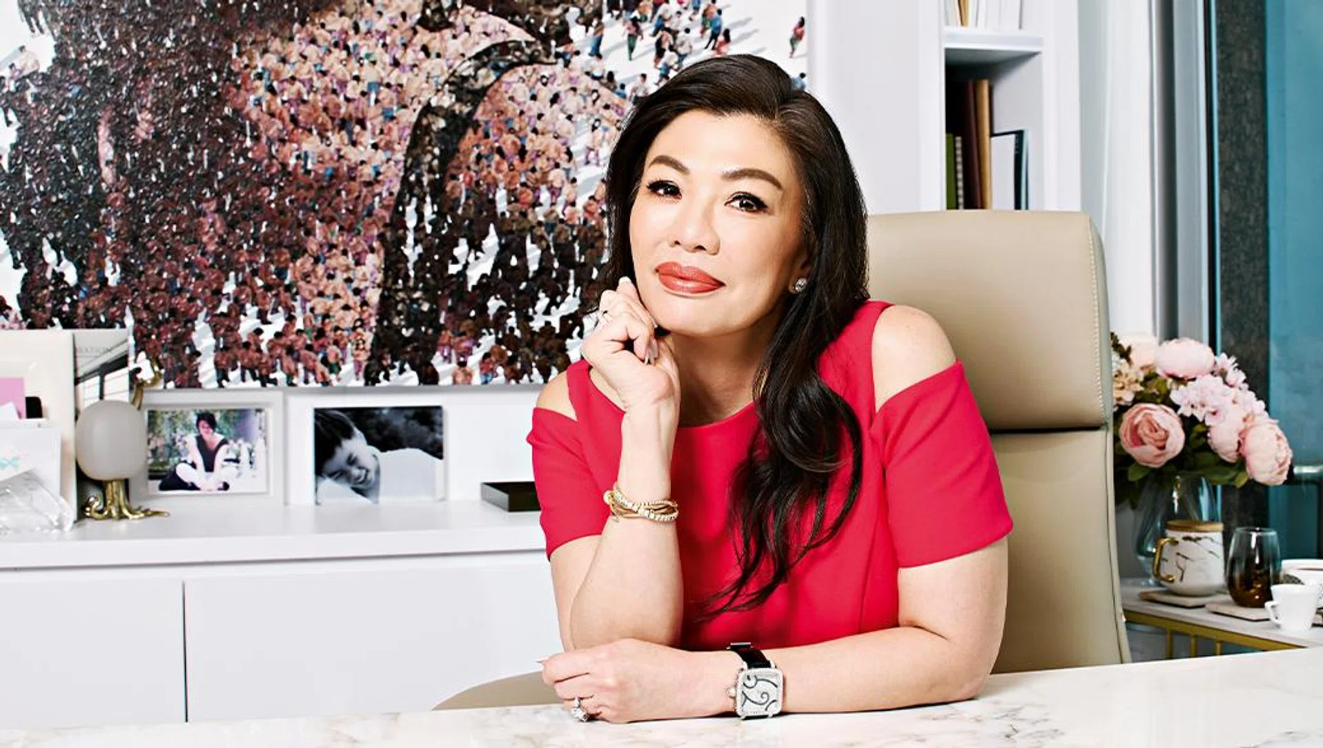 Her personal office, however, tells a different story. A striking Marilyn Monroe painting anchors the wall behind her desk, and the space is softened by a palette of white, purple and pink. On the walls and shelves are photos of her son, Jonathan, who is now 26 years old.