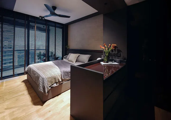 As the original layout of the master bedroom was smaller than what Su-yin preferred, the interior designer halved the wardrobe area and gave the room a barn door to extend the space. This also allows more natural light to flow through the room and into the en-suite bathroom.